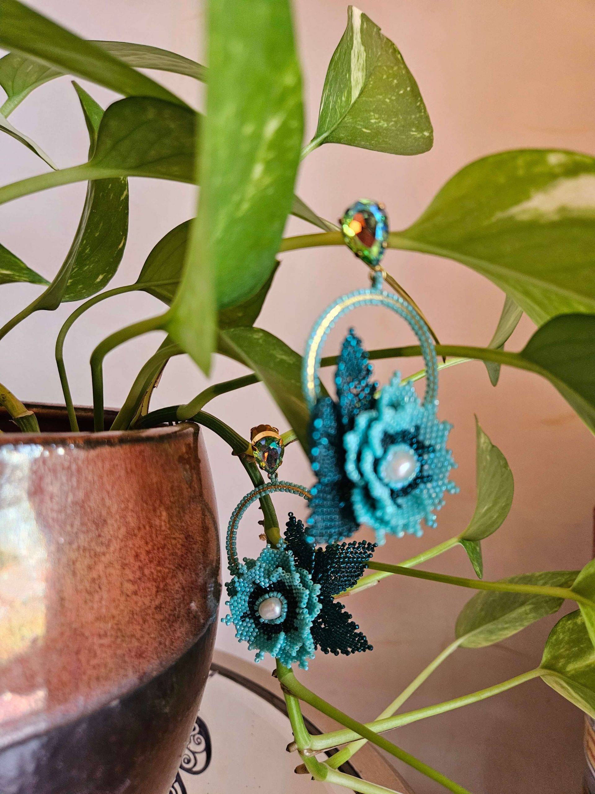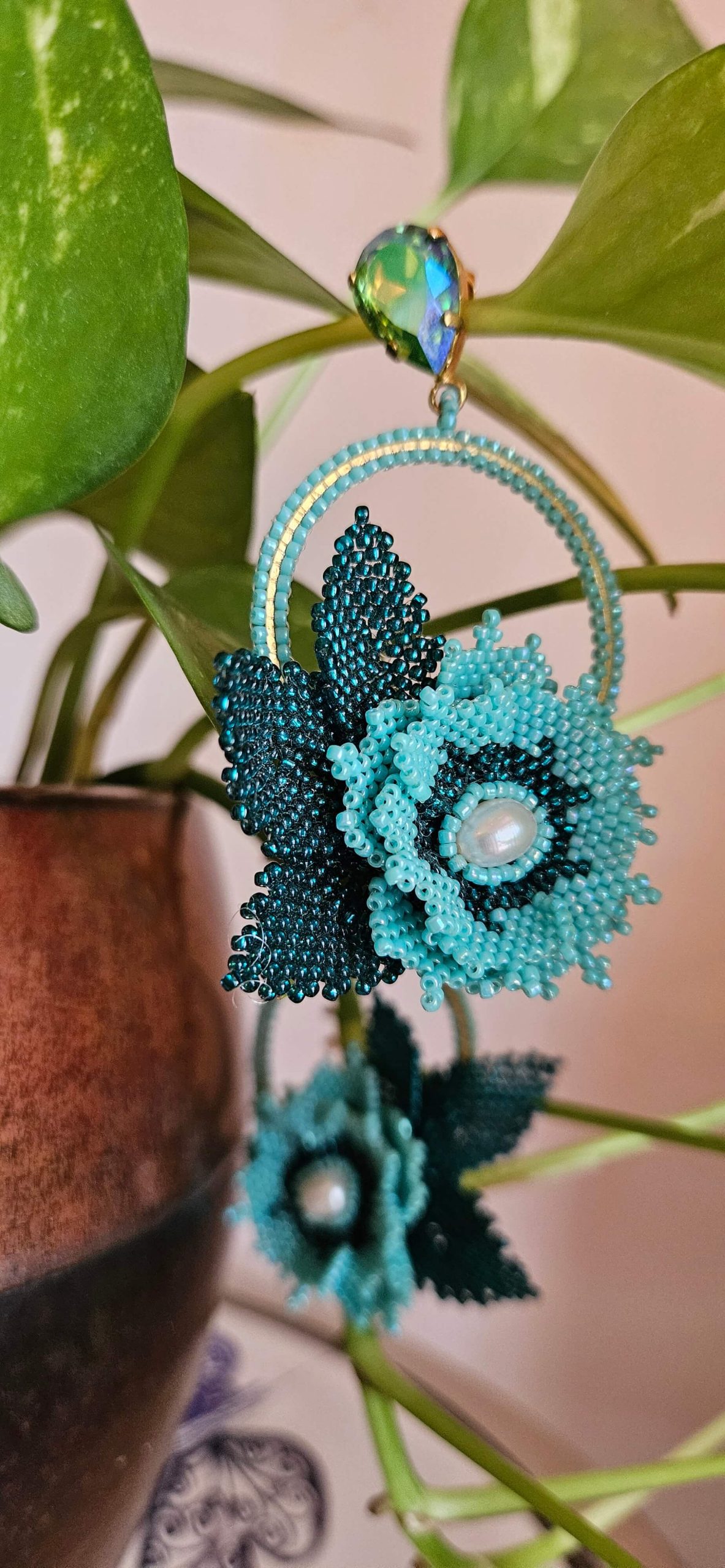 Hermosos y originales aretes con flores 3D, tejidos a mano en cristales de Miyuki en tonos teal y turquesa. Hechos en Panamá.