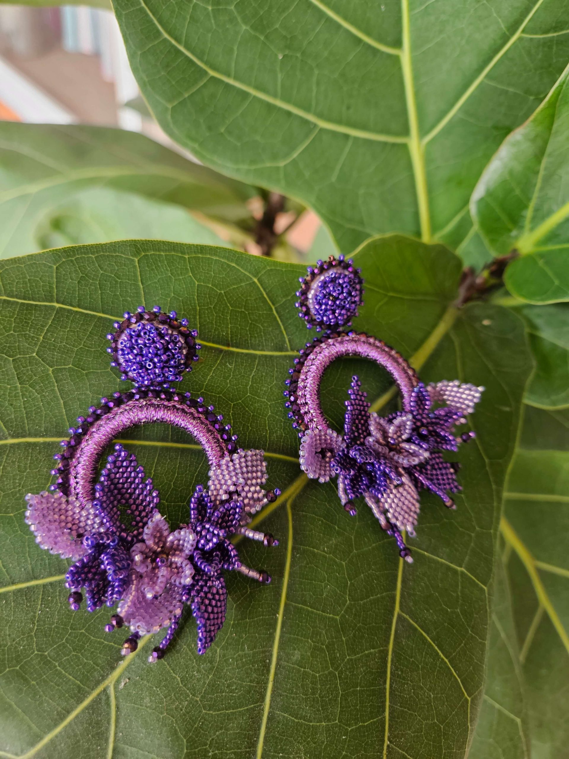 Hermosos y originales aretes con flores 3D, tejidos a mano en cristales de Miyuki en tonos morados y lilas. Hechos en Panamá.