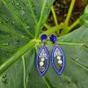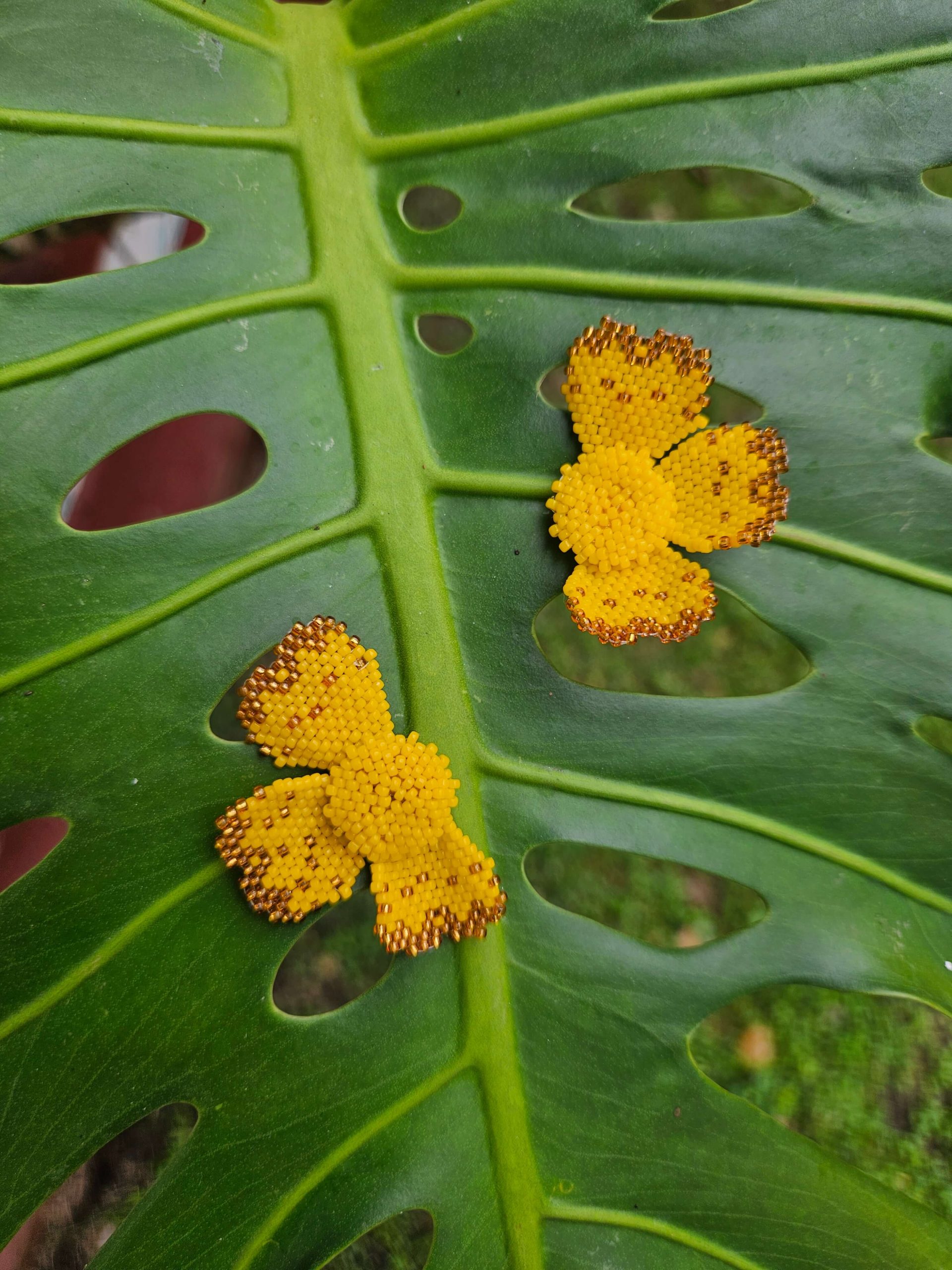 Aretes de flores amarillas tejidos a mano, en chaquiras amarillas y doradas. Hechos en Panamá.