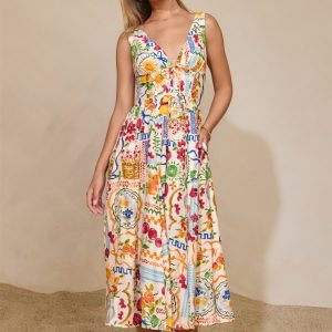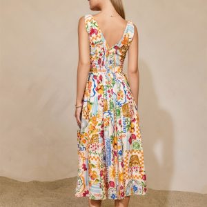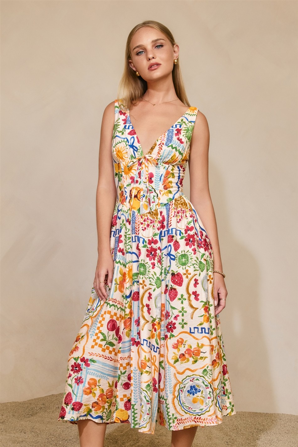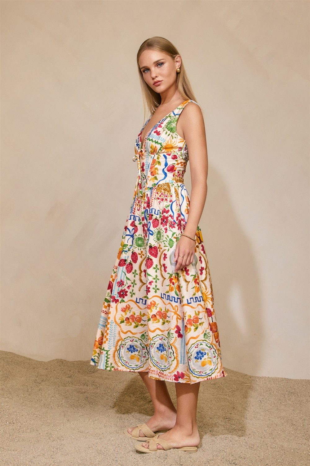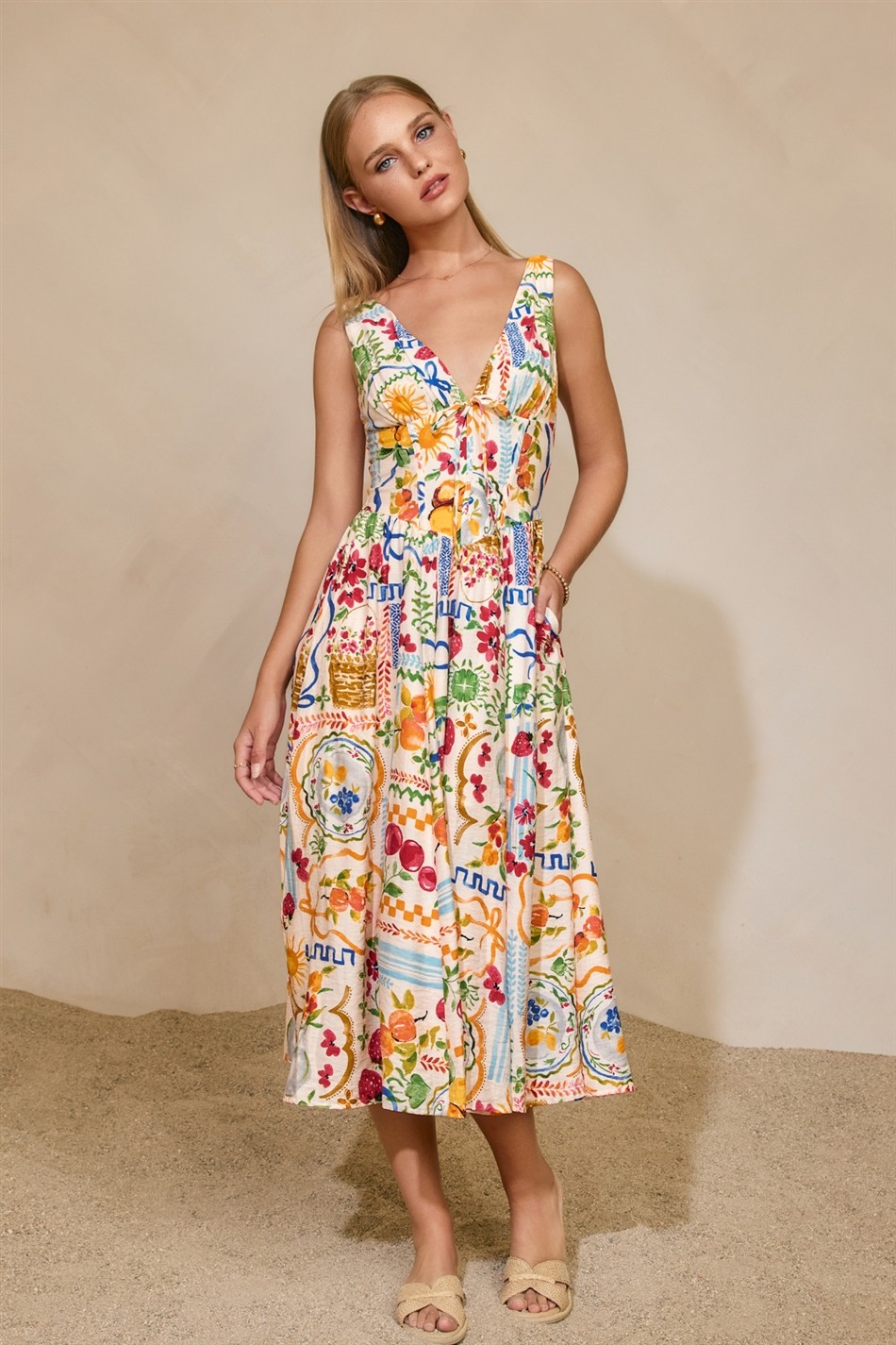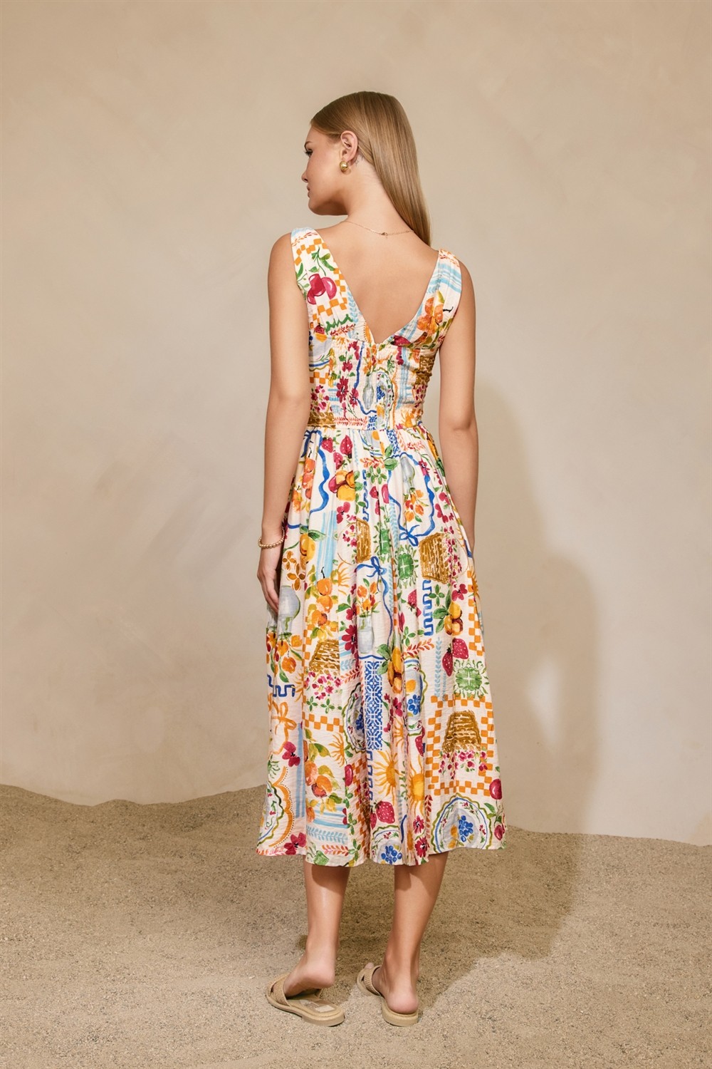 Hermoso vestido en estampado de picnic, con detalle tipo corsé en la cintura. Falda amplia y bolsillos.