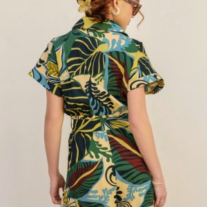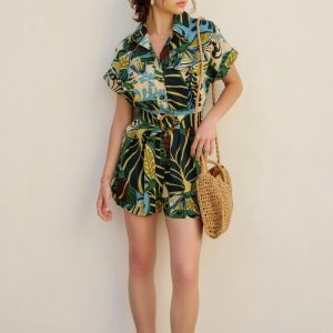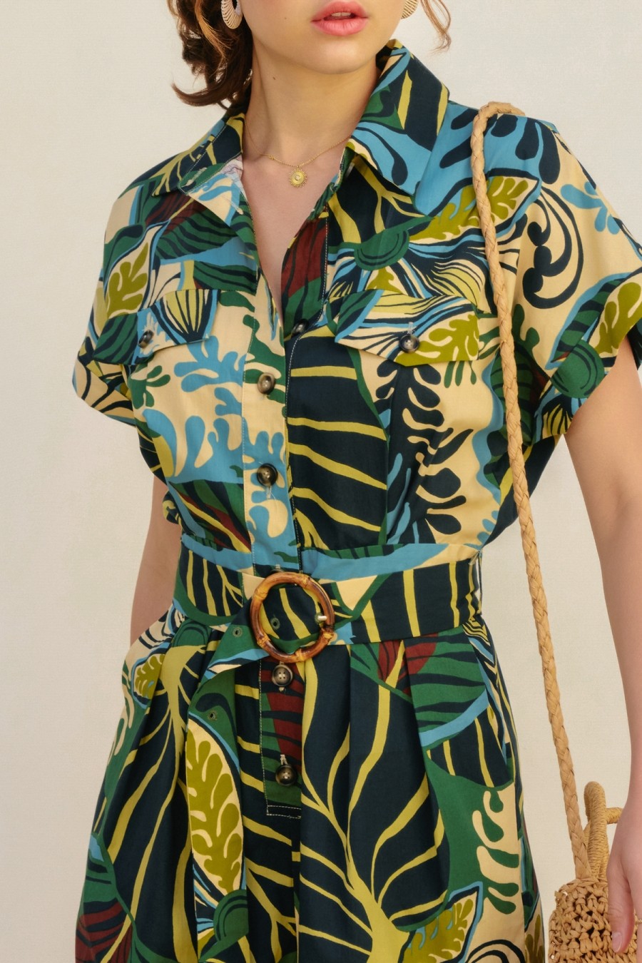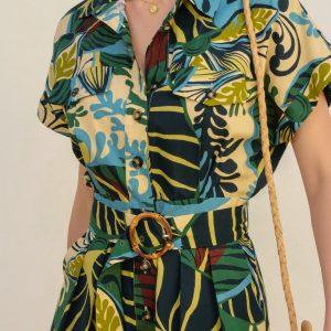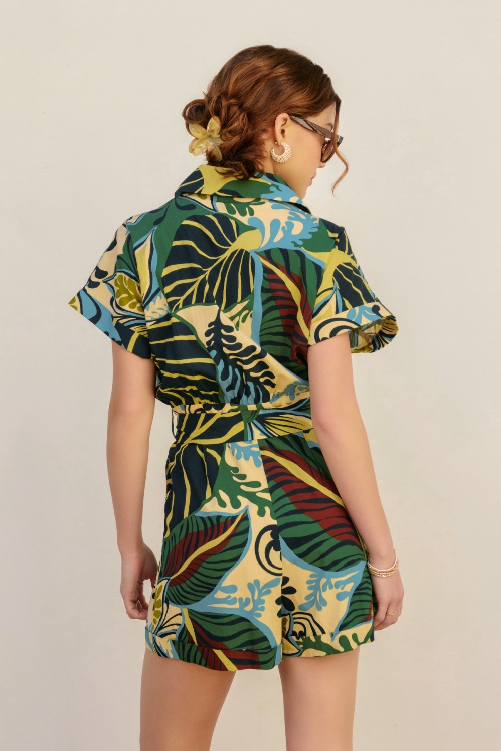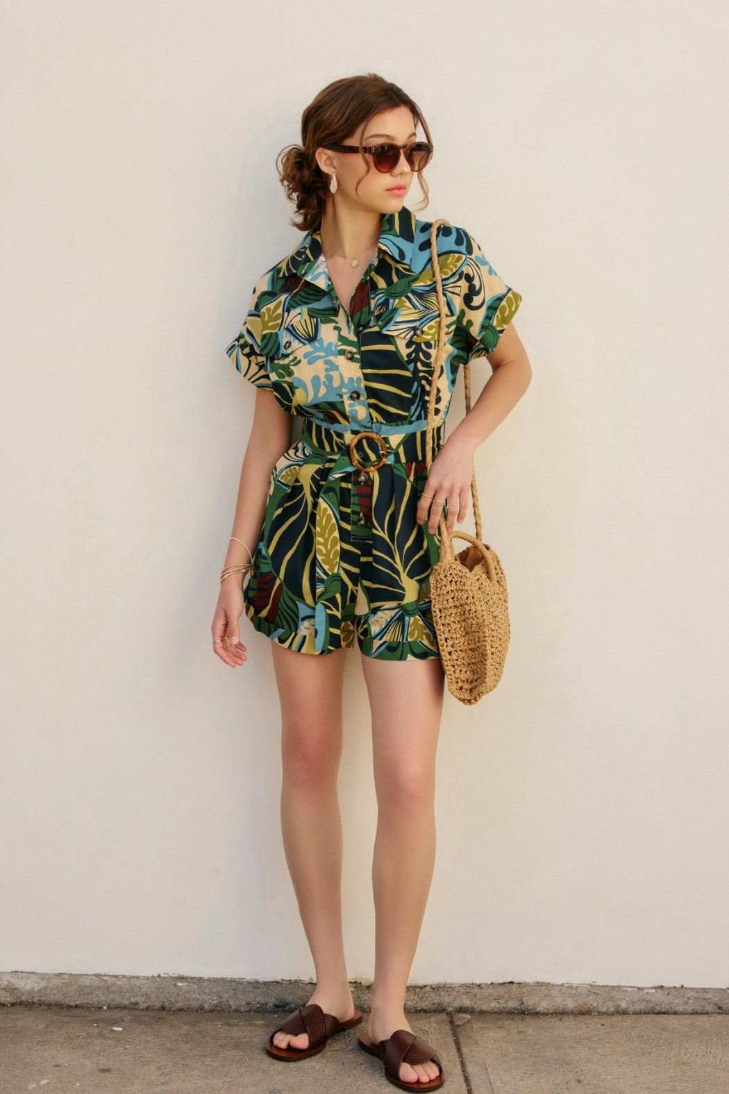 Hermoso romper en estampado tropical con fajón a juego y hebilla de madera. Perfecto para los festivales de verano y cualquier salida de fin de semana.
