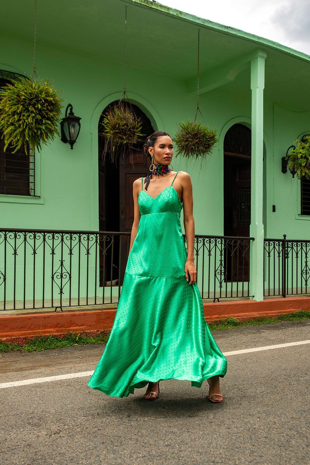 Como una suave caricia, este vestido en charmeuse verde esmeralda, de sutil textura de polka dots y tiras trenzadas, es la mezcla ideal de romance y sensualidad.